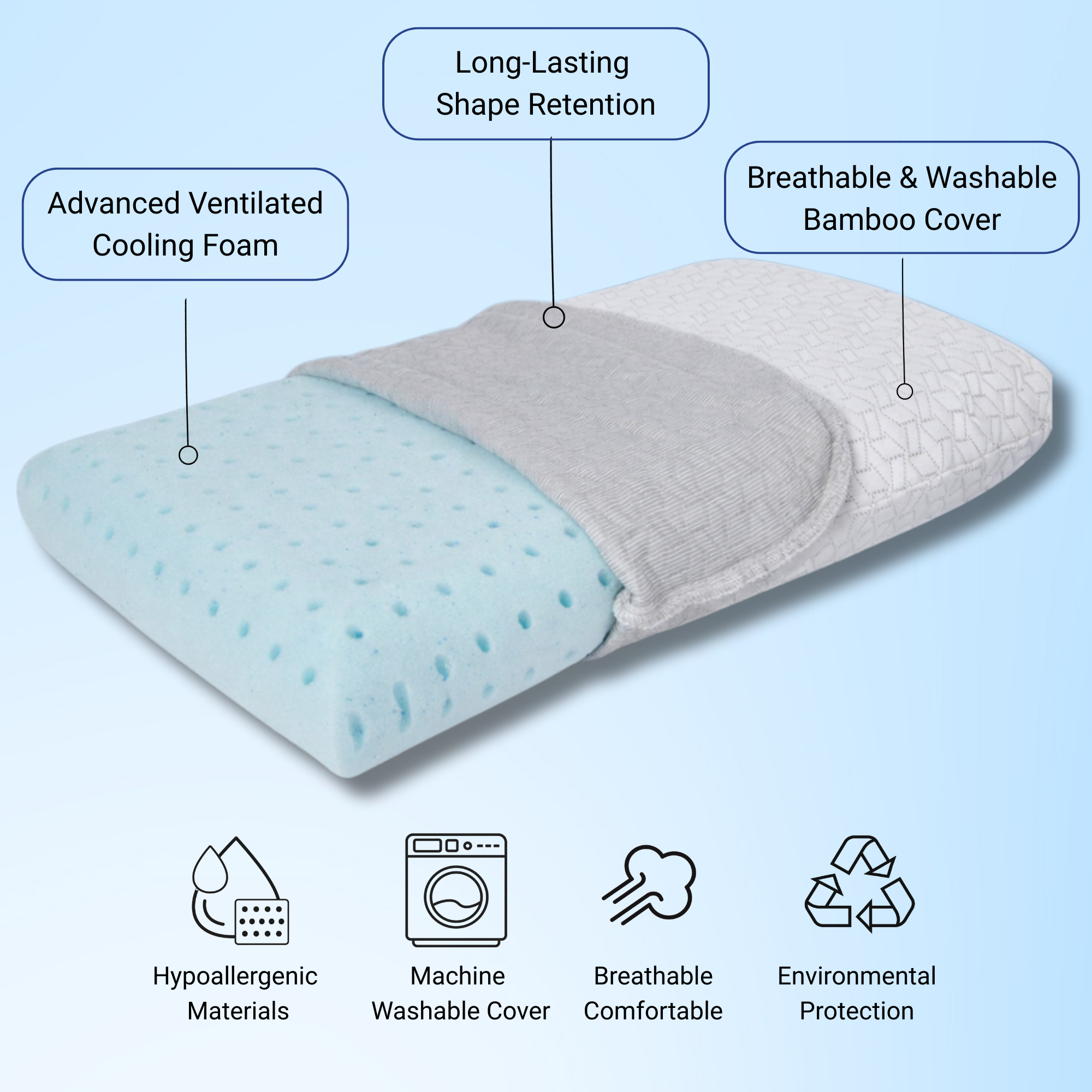 Built with hypoallergenic materials and ventilated memory foam, this pillow reduces allergen exposure while delivering consistent comfort.